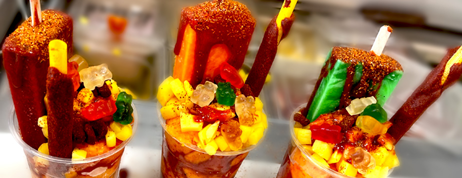 Fried Mexican Flour Crisps based topped with sour cream, cabbage, tomatoes, cueritos (pork rind), cotija cheese, salsa valentina, cilantro plus hot cheetos and one Elote.