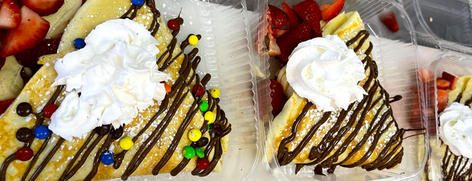 Crepes served with your choice of three toppings (caramel, chocolate, strawberry jam, lechera, nutella, creamcheese, bananas, strawberries, peach, apples, berries, pecans, coconut, almonds, sprinkles, chocolate) topped with whiipped cream.