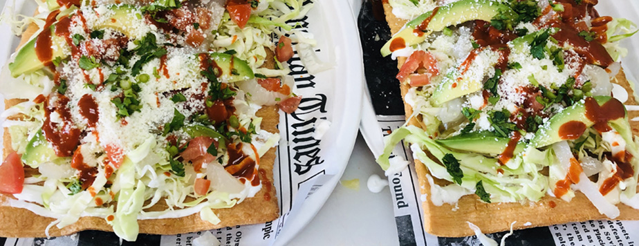 Fried Mexican Flour Crisps based topped with sour cream, cabbage, tomatoes, cueritos (pork rind), cotija cheese, salsa valentina, cilantro.